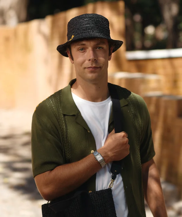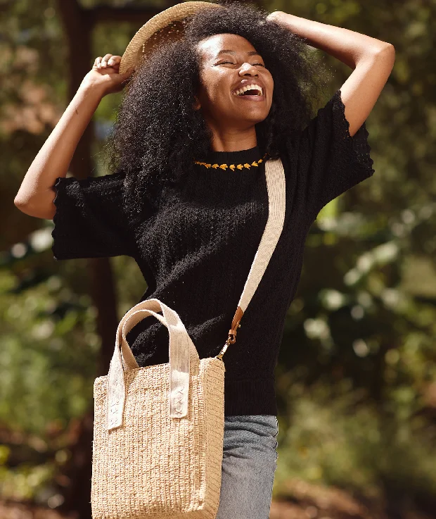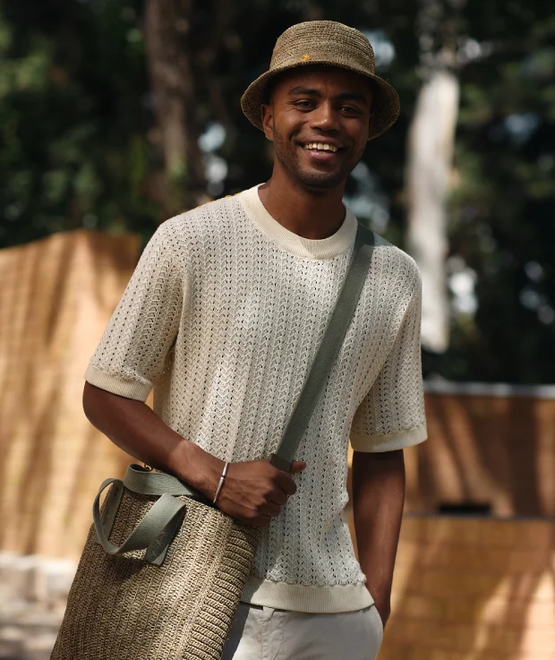 Ajoutez une touche finale avec un chapeau tricoté et un sac en raphia.