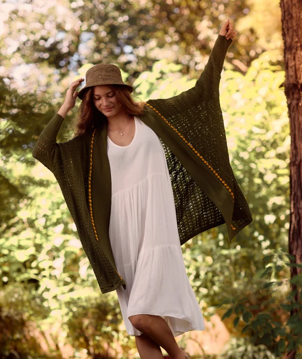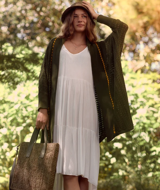 Pour elle : robe en maille, cardigan léger ou chemisier à manches courtes pour un style chic et estival.