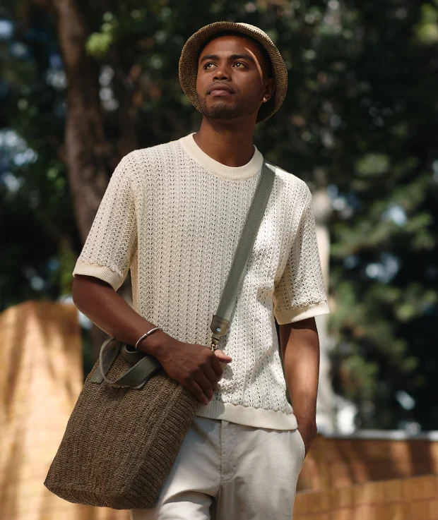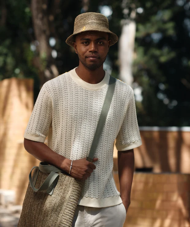 Tee-shirt col rond en coton supérieur, avec maille ajourée et broderie main. Une pièce légère, idéale pour l’été.
